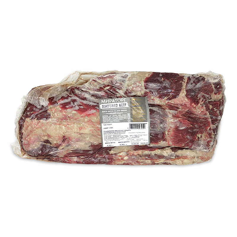Чак Ролл - это стейки из длиннейшей мышцы спины, которая идет вдоль оси грудных позвонков до 5 ребра. При изготовлении чак-ролла уже удалены грубые сухожилия, сверху есть тонкая жировая прослойка, которая делает мясо сочнее и нежнее. Чак Ролл идеально подойдет для тушения или запекания. Из него получается потрясающий шашлык, а благодаря идеальному сочетанию мяса и жира можно сделать великолепный, сочный и нежный домашний фарш.